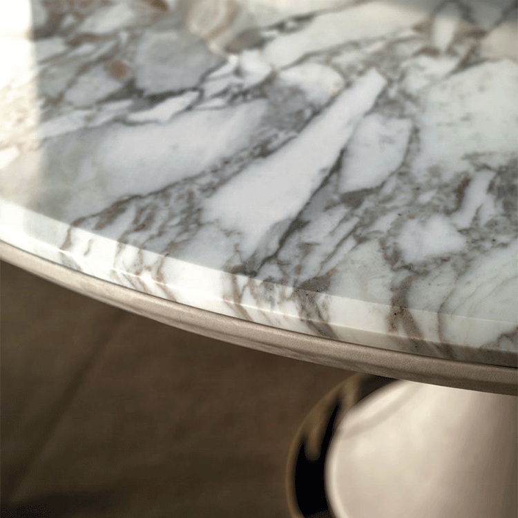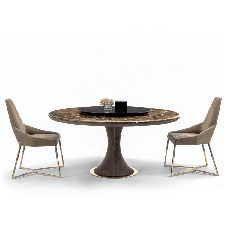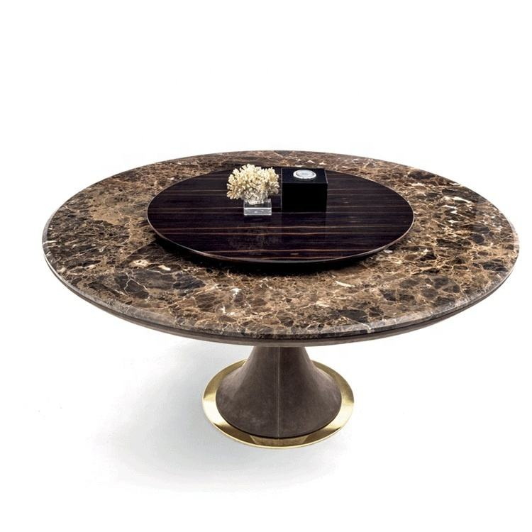 Traditional designround table made of a hyperboloid shaped base in glass fibre covered in range leathers with an underbase plate