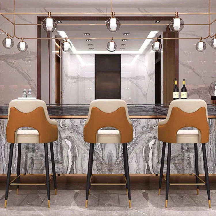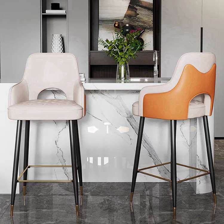 The sculptured bar chair is supported by tapered tall framed legs finished by lacquered walnut wood