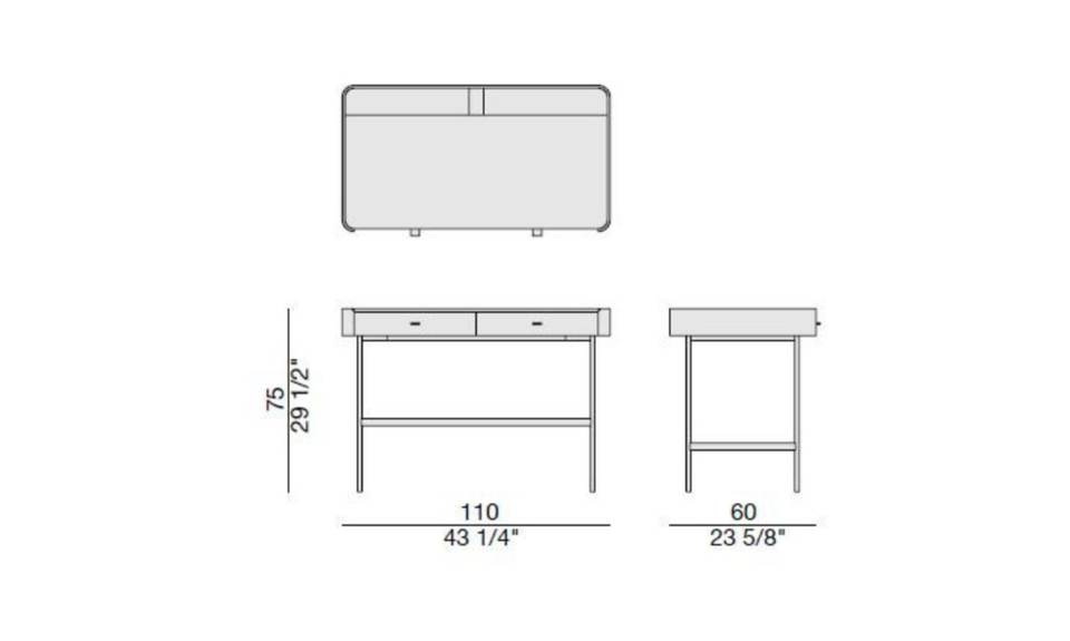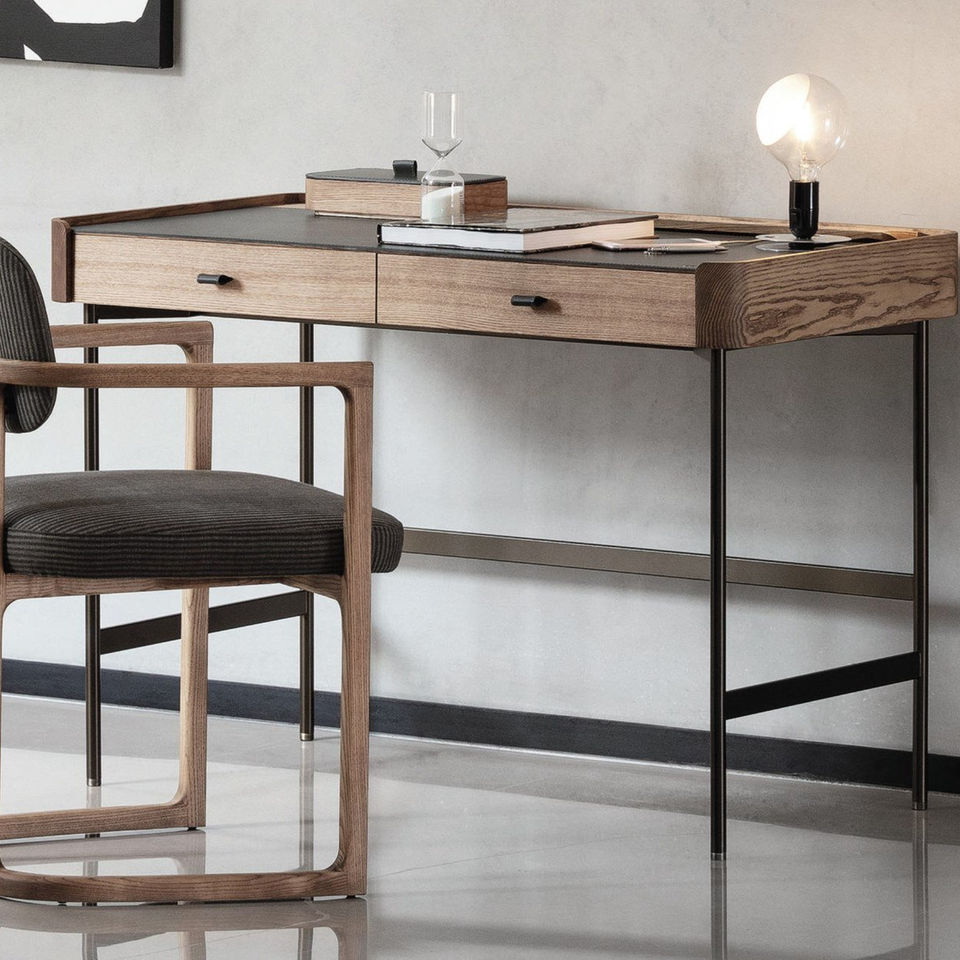 leather top dressing table in solid ash with metal frame and two storage drawers